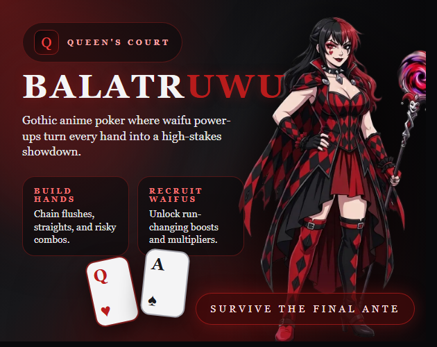BalatrUwU is a gothic anime poker roguelite where every run is a climb through the Queen’s Court. Build powerful hands, manage your discards, and recruit waifu companions with unique abilities that can completely change your scoring strategy.
